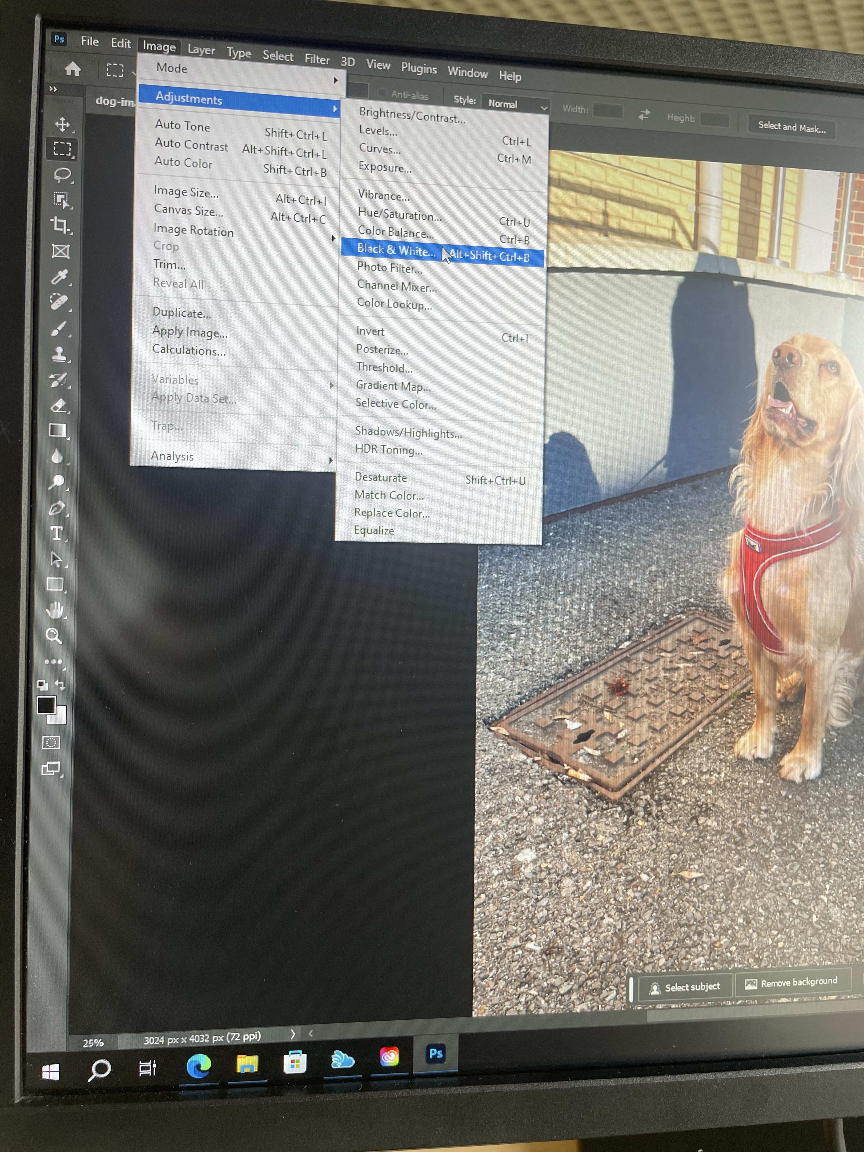 Immediately you adjust the image, Photoshop will pop the Black and White window for you to adjust the color settings.