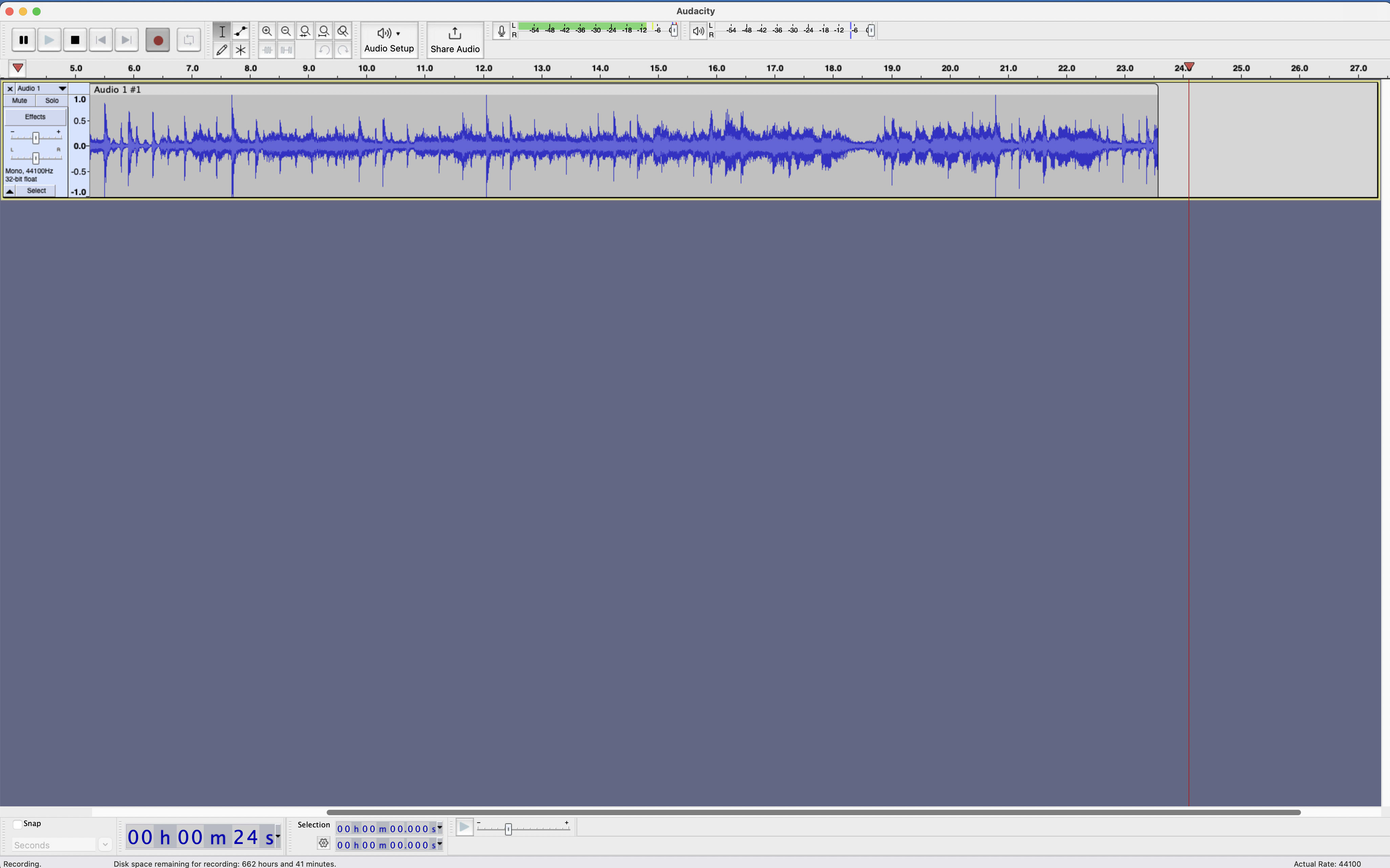 Launch the Audacity software and record a sample audio with a minimum length of 20 seconds as shown in the following image;
