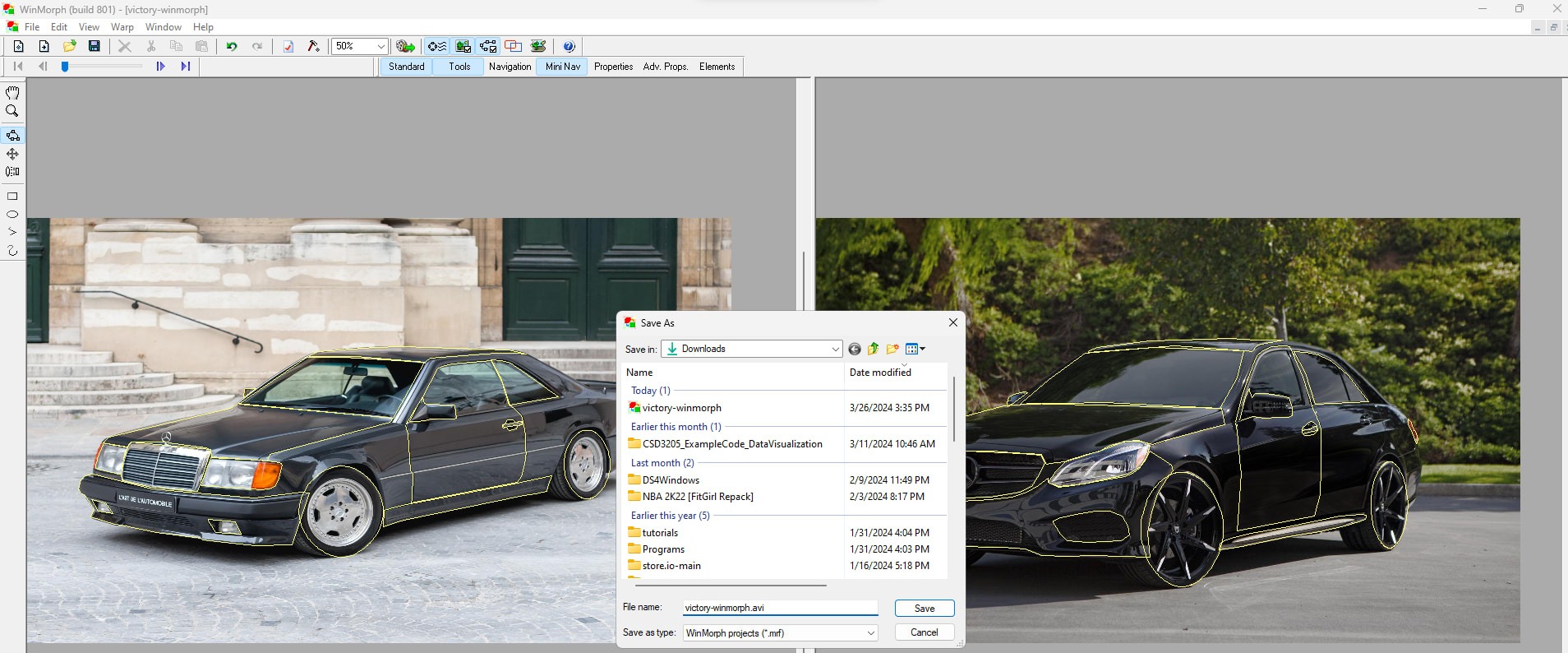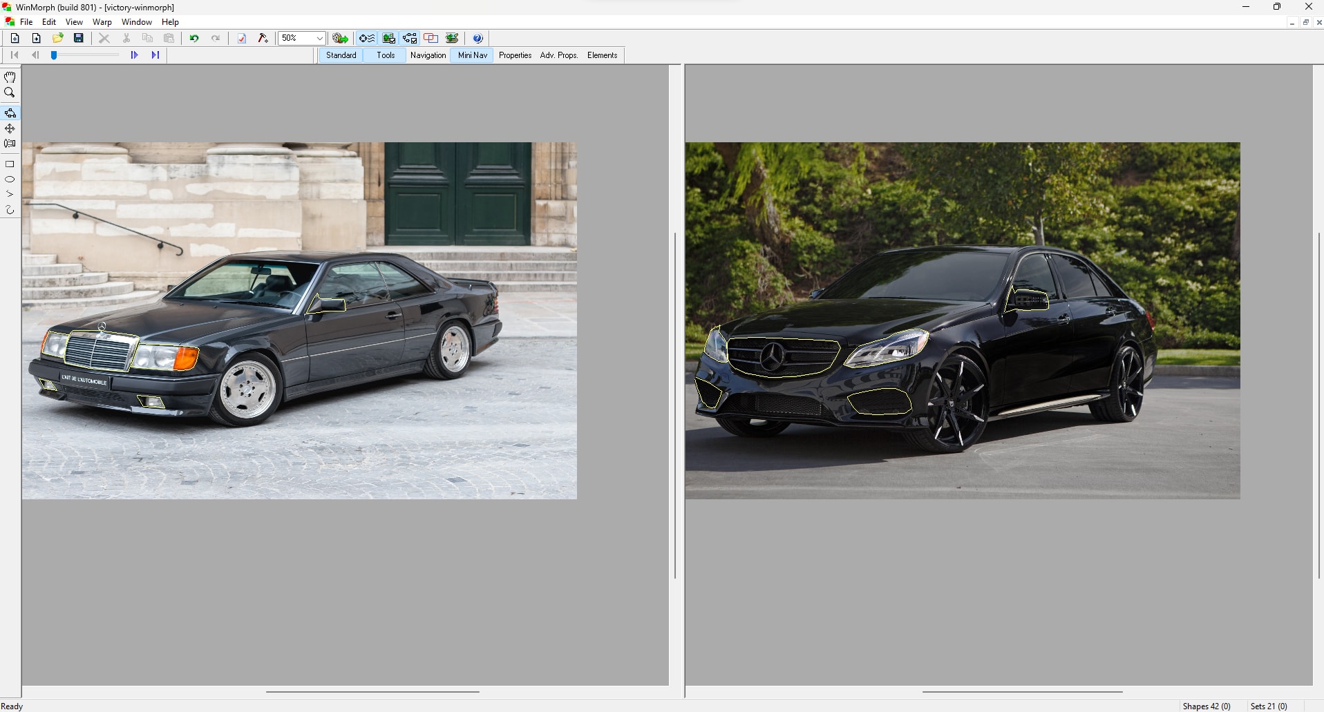 The following example shows a well-mapped Winmorph project that morphs the vintage 1992 Mercedes AMG E-Class series with the 2014 Mercedes AMG E-Class series.