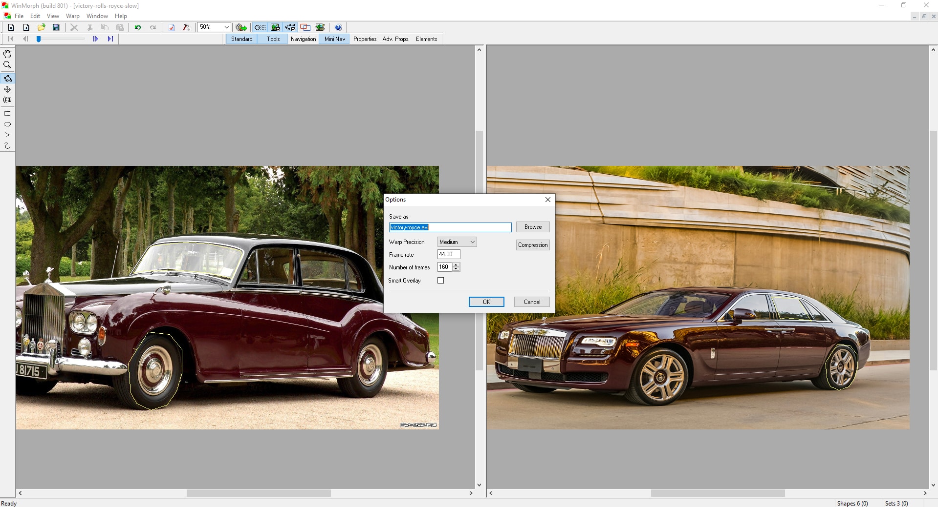 The morphing above is bad because the bumper part of the vintage Rolls Royce was wrongly mapped to the rear part of the modern Rolls Royce. This example shows the results of mapping morph points incorrectly.